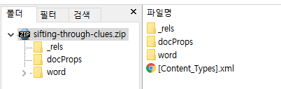 아까 본 [Content_Types].xml 파일이 존재 하고 word 라는 폴더가 있습니다.