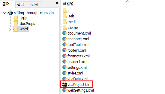 docx파일과 docm 파일의 차이는 매크로의 사용 유무라고도 할 수 있기에 word 폴더에 들어가 매크로 파일이 있는지 확인해 보겠습니다.