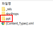 이는 docx 또는 docm 파일을 의미하는데 pptx 파일은 아래와 같이 ppt 라는 폴더가 있습니다.